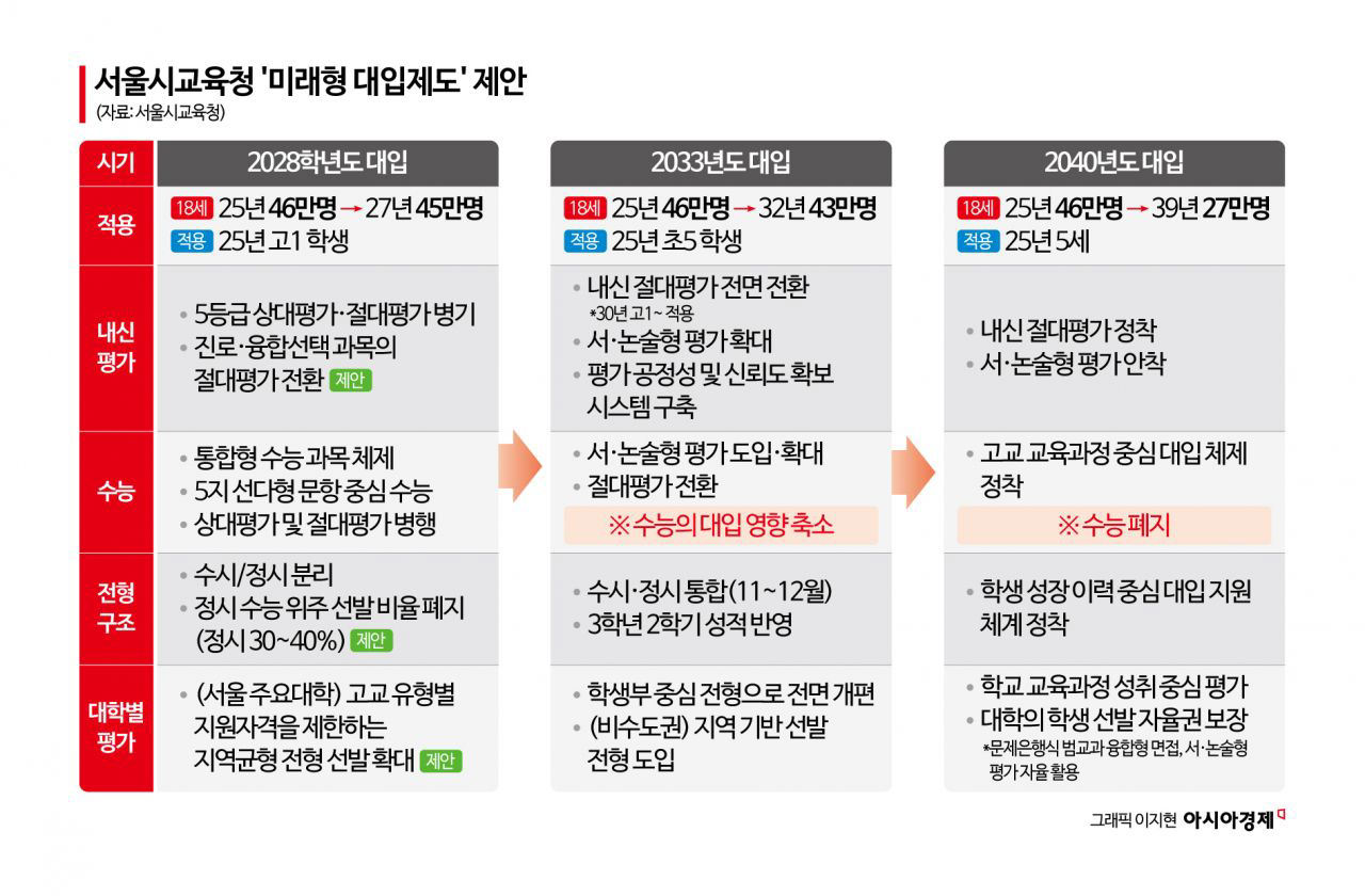 - 최근 서울특별시교육청이 발표한 미래형 대입 제도 제안에 따르면, 2040학년도 대입부터는 수능을 완전 폐지해야 한다는 의견이 제시되습니다.